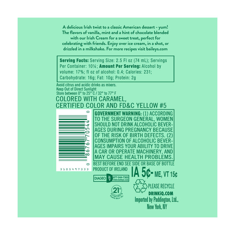 Baileys Cream Liqueur Vanilla Mint Shake Limited Edition 34