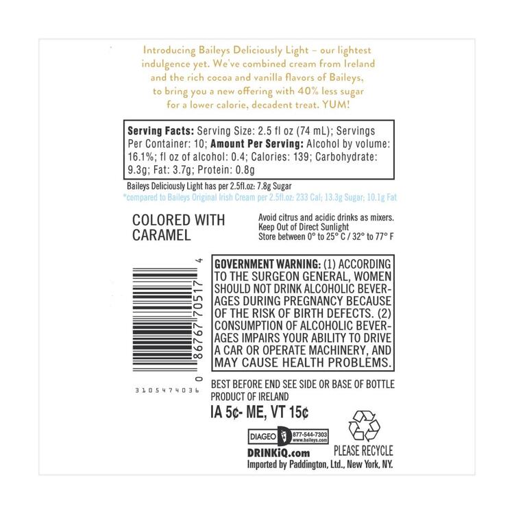 Indulge but keep it light with Baileys Deliciously Light. We've combined cream from Ireland and the rich cocoa and vanilla flavors of Baileys to create a sweet treat with 40% fewer calories and 40% fewer grams of sugar than Baileys Original Irish Cream.* Whether you're enjoying a light brunch or a relaxing evening at home, the silky vanilla and rich chocolate flavors of Baileys Deliciously Light are ready to make everyday moments a treat. Looking for a delicious low-calorie dessert option or after-dinner drink? Baileys Deliciously Light is the perfect choice.