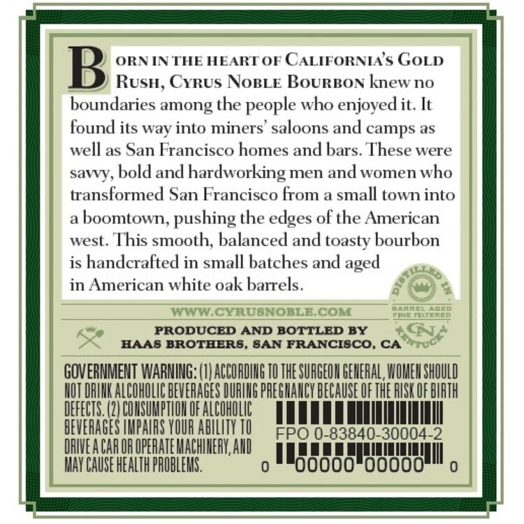 Cyrus Noble a true West Coast brand established since 1871. Distilled in small batches from a family mash bill recipe, each bottling reflects the spirit and character of a handmade, intimate and unrushed production method. Distilled by Bardstown Bourbon Company in Bardstown, KY and bottled by Haas Brothers.