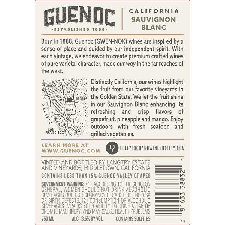 The Guenoc California Sauvignon Blanc is cool fermented in stainless tanks to retain its natural fruit aromas and flavors. Its mouthwatering aromas and flavors of pineapple, mango and orange blossom, lead into a crisp and slightly sweet palate. The finish is long and refreshing with lively acidity. Enjoy this wine with light seafood and good friends.