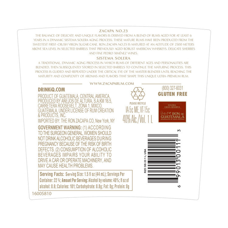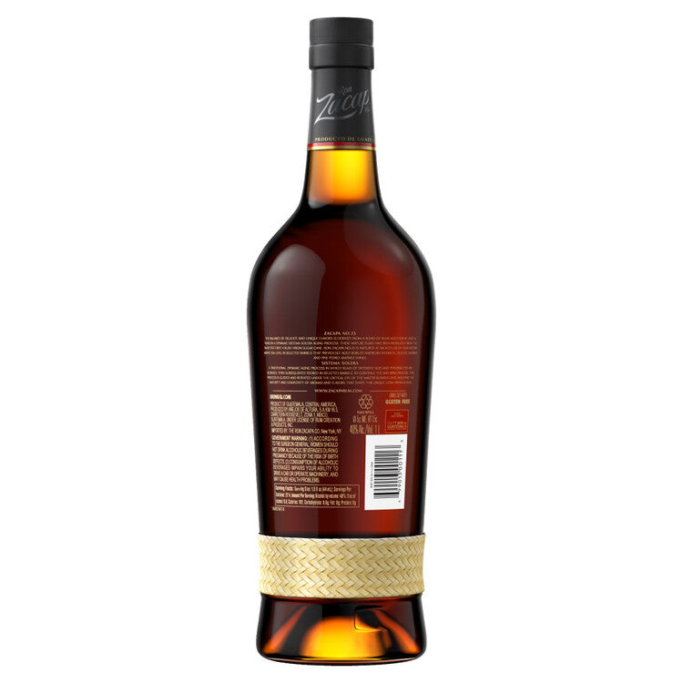 Zacapa No. 23 is an award-winning Ultra Premium aged rum, masterfully crafted in Guatemala using the first press of sugar cane and aged 2300m 'Above the Clouds' to slow the aging process, developing layers of aromas and flavors within the rum. The balance of delicate and unique flavors of Zacapa No. 23 is derived from a blend of aged rums between 6 and 23 years old, originating from our take on the "Sistema Solera" aging process. Zacapa No. 23 is aged in selected barrels that previously aged robust American whiskey, delicate sherries and fine Pedro Ximenez wines, creating a smooth & balanced rum. Every bottle of No. 23 is adorned with a hand-woven petate band crafted by our community of over 700 Guatemalan weavers. Zacapa No. 23 Rum is best served neat, on the rocks or in your favorite dark spirit cocktail. Please drink responsibly.