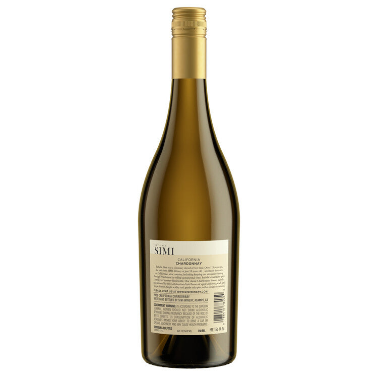SIMI California Chardonnay White Wine showcases luscious fruit flavors of apple, pear, peach, and tropical fruit. This barrel aged wine has bright acidity and gentle oak spice with a creamy mouthfeel.