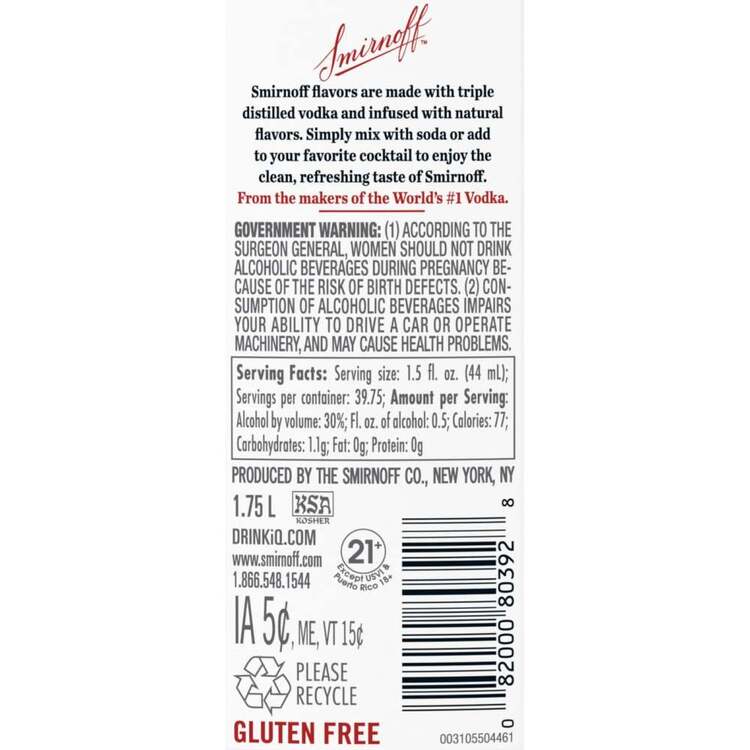 Infused with a natural lime flavor for a refreshing citrus taste, Smirnoff Lime is perfect for your next cocktail party. It features a tart citrus flavor, which adds a great balance to your mixed drinks. Gluten-free, this 60 proof spirit is smooth enough to drink by itself on the rocks or for a round of shots. Simply mix with club soda, cranberry juice, or orange juice for a sweet and tangy drink that's easy to create and is sure to delight. Smirnoff Lime's tasty fruit-infused flavors allow for endless unique drink ideas.