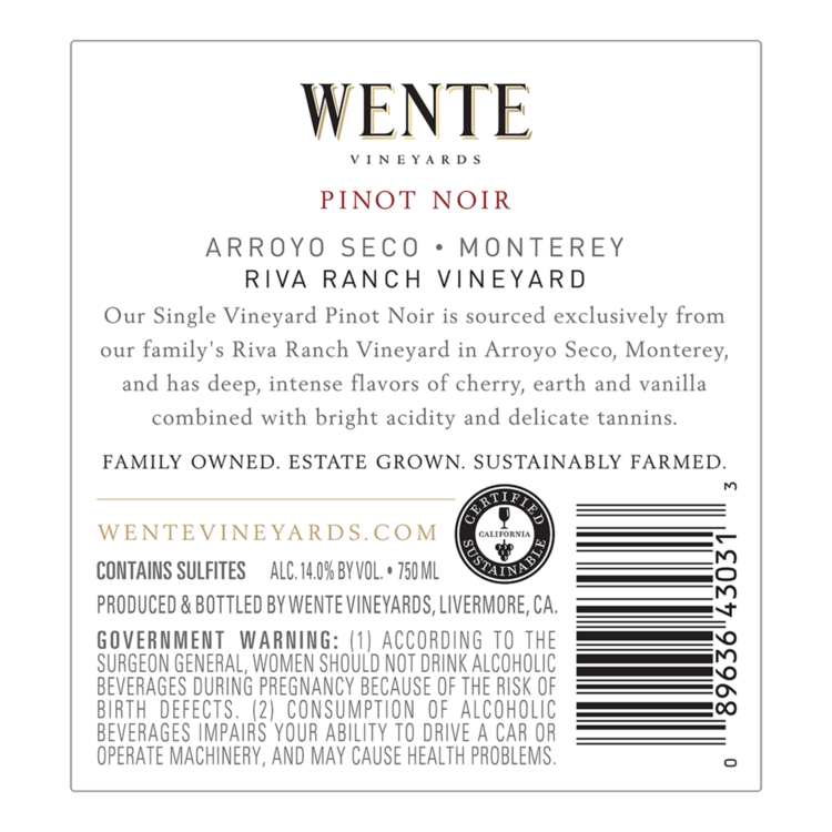 Wente Vineyards Pinot Noir Riva Ranch Vineyard Arroyo Seco - 750ML